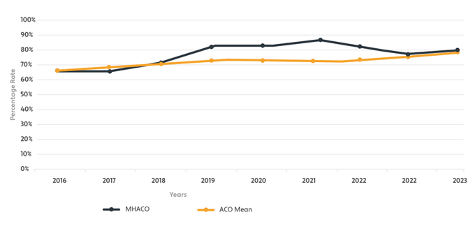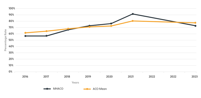 Thanks to these efforts, the Memorial Hermann ACO demonstrated a trend of improvement in screening mammograms from 2016 through 2023.